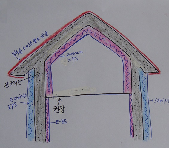 지붕도 콘크리트 타설을 하고 위처럼 어려운 과정을 거쳐 외단열을 하는 건 그만의 장점이 있어서인가요? 구조적으로나 아니면 축열성능을 위해서 이거나..