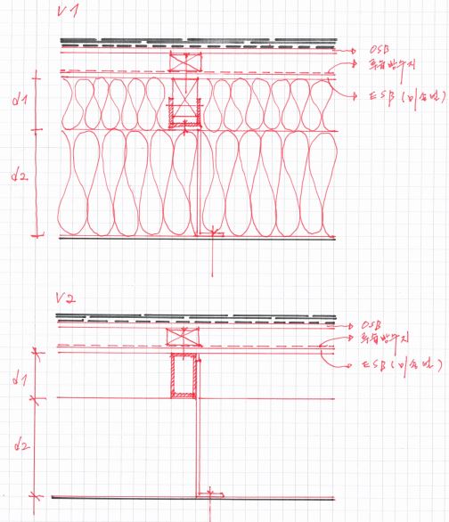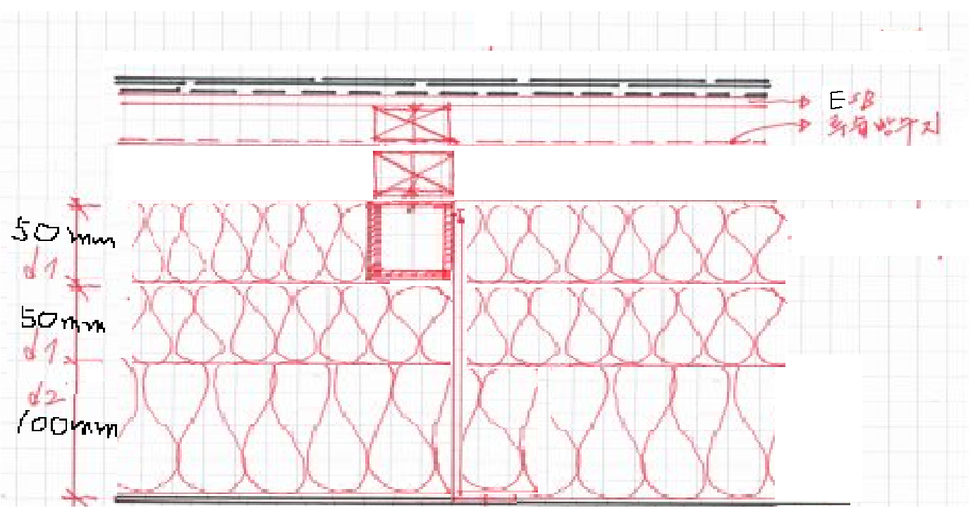 비용 절감을 위해 ESB 합판을 없애자는 취지인데, 이렇게 되면 암면 위에 나무 상 만큼 50mm정도 공간이 생기고 그 위에 투습방수지가 있고, 그 위에 다시 나무 상 만큼 50mm가 뜨고, 그 위에 합판과 방수쉬트와 슁글이 붙게 됩니다.