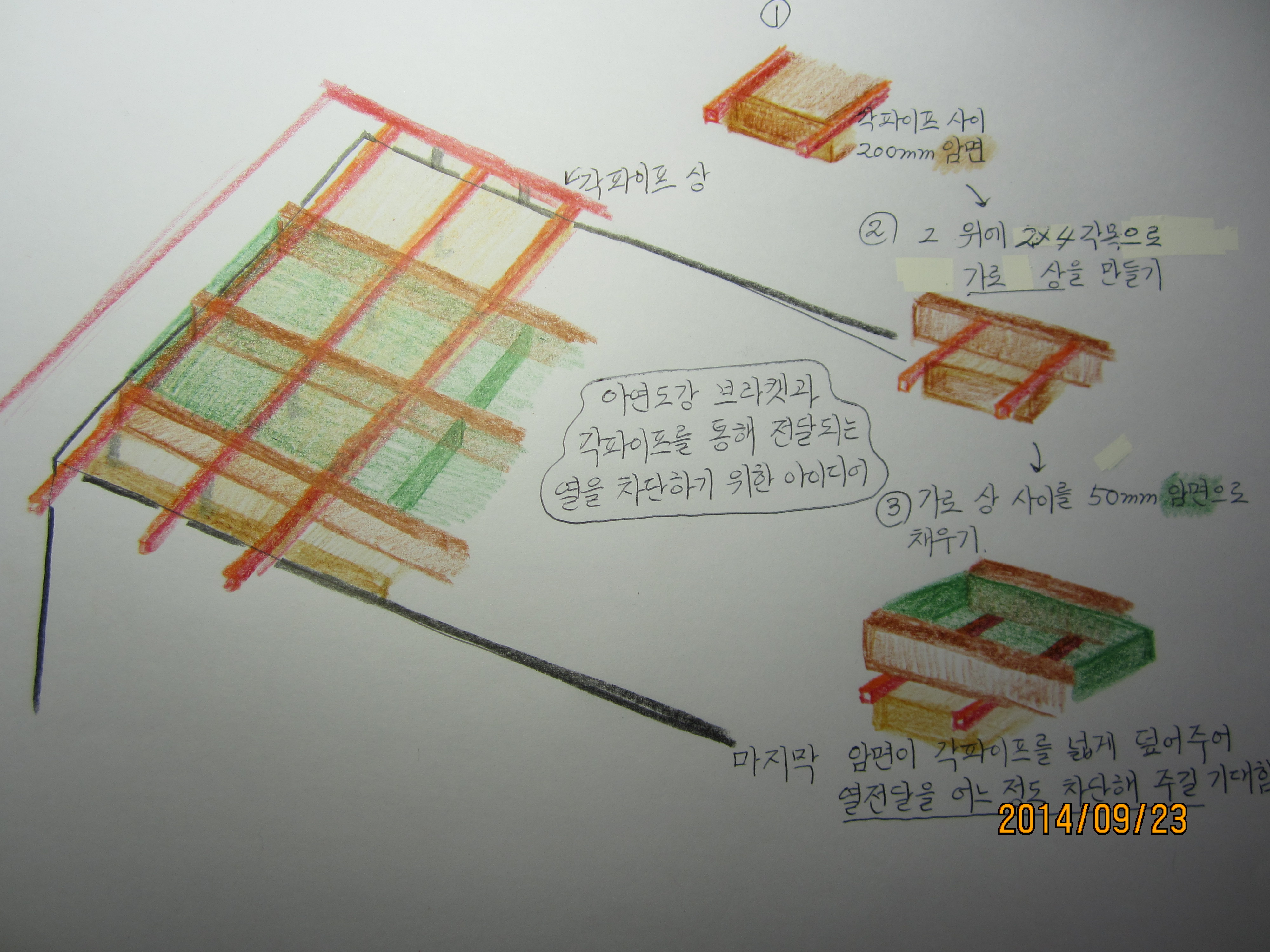 오늘도 아연 브라켓의 열전달을 줄이기 위해 무엇을 더 하면 좋을까 열심히 생각하다가 괜찮아 보이는 아이디어를 생각해 냈습니다. 핵심은 가능한 한 각파이프와 아연강이 외기와 직접 닿지 않도록 단열재 안에 '포~옥' 싸이게 하는 것인데, 다음 그림과 같이 각파이프 위에 2*4 각재로 가로 상을 만들고, 그 사이를 50mm 암면 단열재로 한번 더 채우는 것입니다.