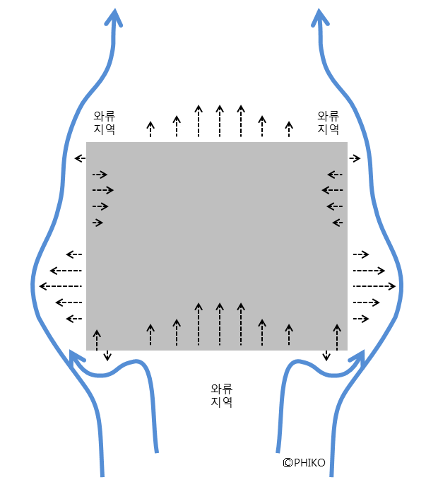 바람이 불어 오는 방향의 측면에서 앞 쪽과 후면 쪽은 부압이 형성됩니다.