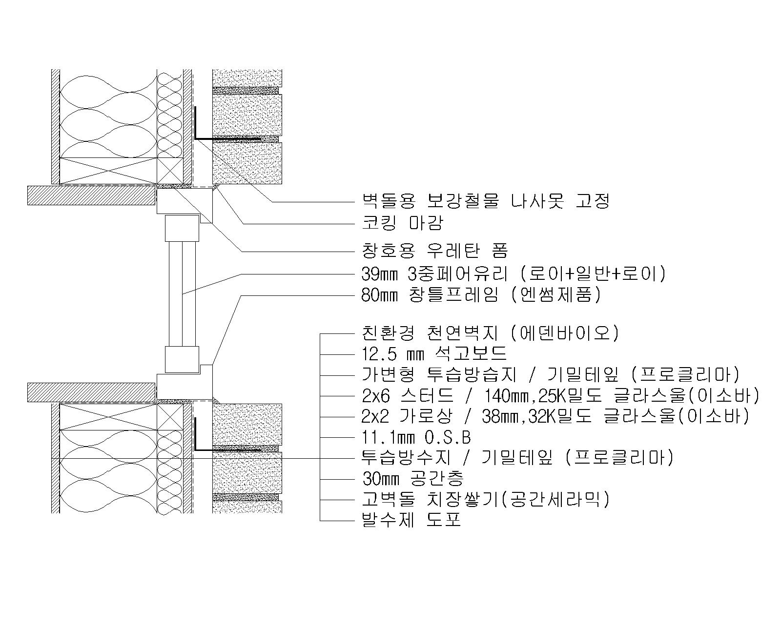 벽체 구성은 상황을 파악하는데 별 도움이 되지 못합니다. 창호와의 접합 디테일도면이나, 시공시의 사진이 있어야 상황을 파악가능하기 때문입니다.