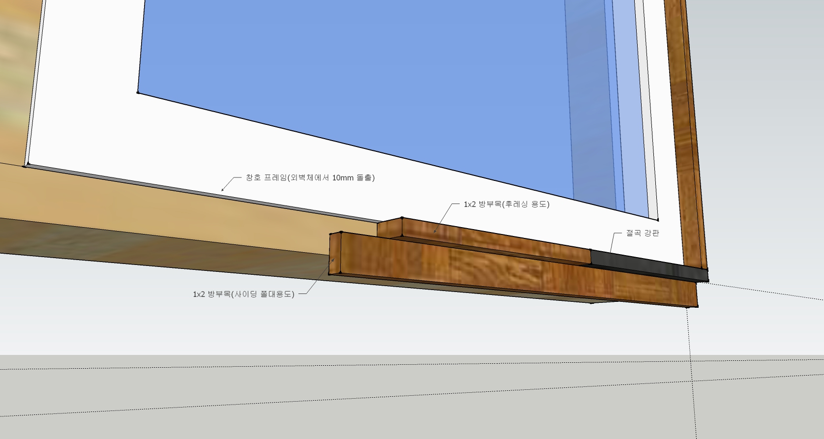 보통 목조주택에서 사이딩 마감 시 창호 배수를 위해서 창호를 외벽에서 돌출하여 고정하는데요..