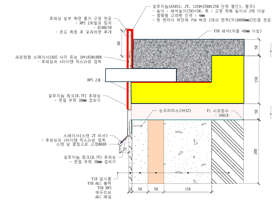 위 그림에서 빨간색 부위에 XPS와 후레싱을 붙이면 XPS의 2차발포가 예상되어서, XPS와 후레싱 사이에 11mm의 중공층을 둔 그림입니다.