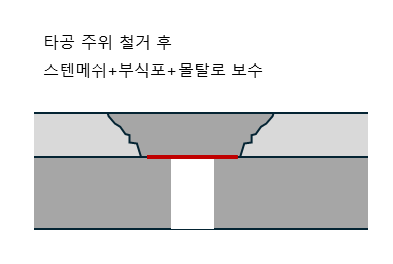 상향 타공이 어려우므로 지금 상태에서 하향 타공을 하는 것이 더 편하긴 하나, 그러면 아래 그림과 같이 철거 작업이 개입되어야 합니다.