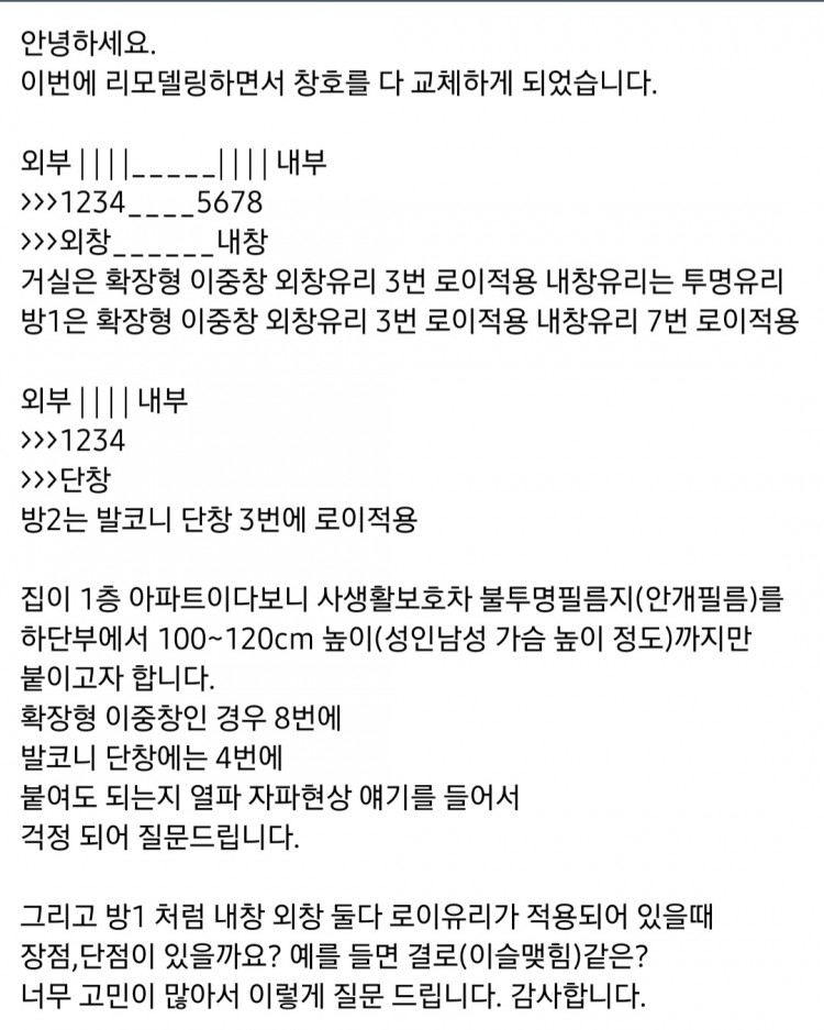 안녕하세요. 반투명필름지는 괜찮습니다. 하셔도 되세요. 이중창의 결로는 운명에 가깝습니다. 둘다 코팅을 하는 것을 선택하신 이유는 알 수 없으나, 내창에만 하는 것 보다는 나은 상황이므로 그 역시 하시어요.