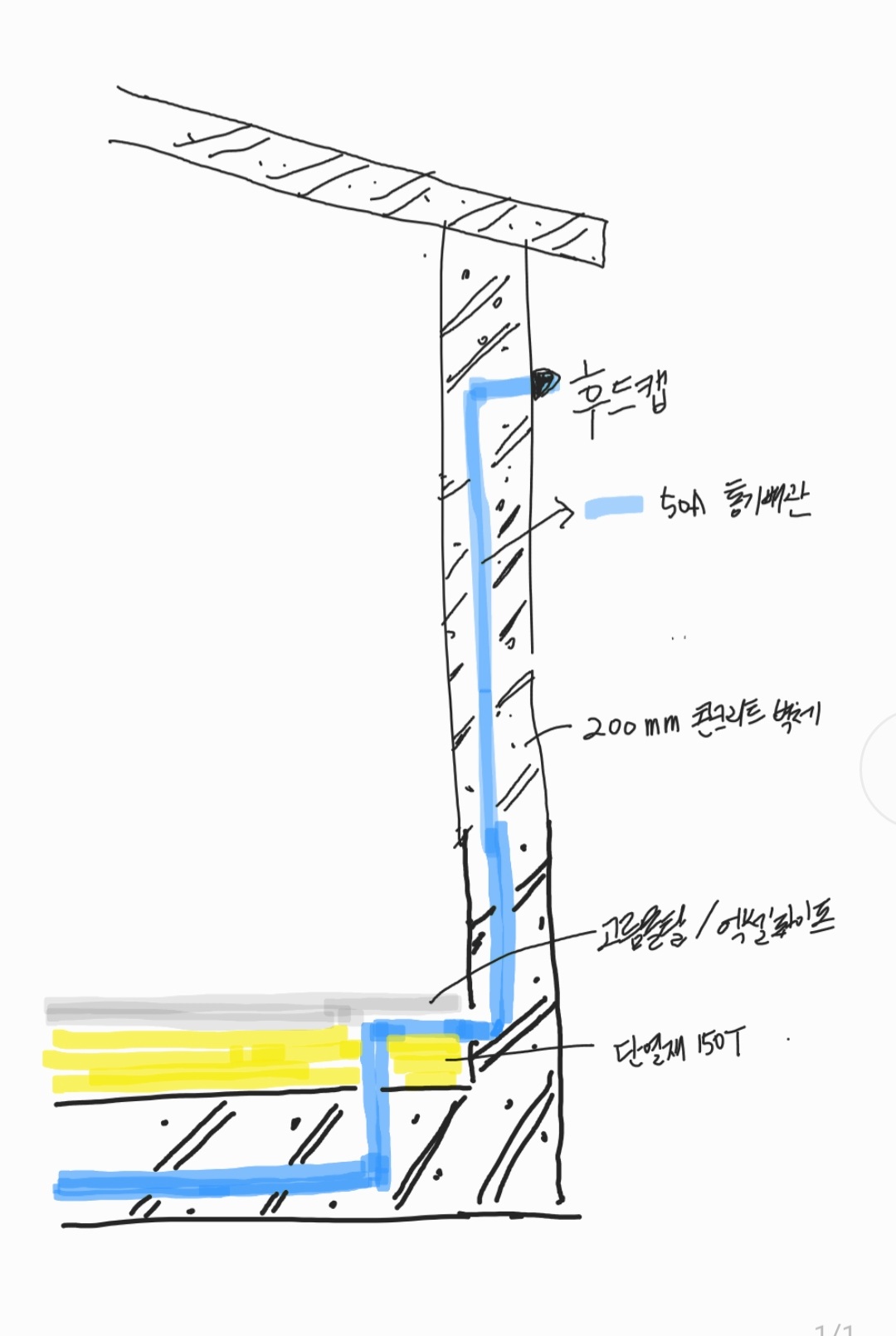 원래는 배수구 유가용도로 만들었다가 불용되면서 통기배관으로 쓰려고 하니 부득이 저런 모양이 되었습니다. 일자소켓과 90도 엘보우 소켓이 이음새없이 바로 붙어있어서 벽체에 넣으려면 저렇게 밖에 안되서요.