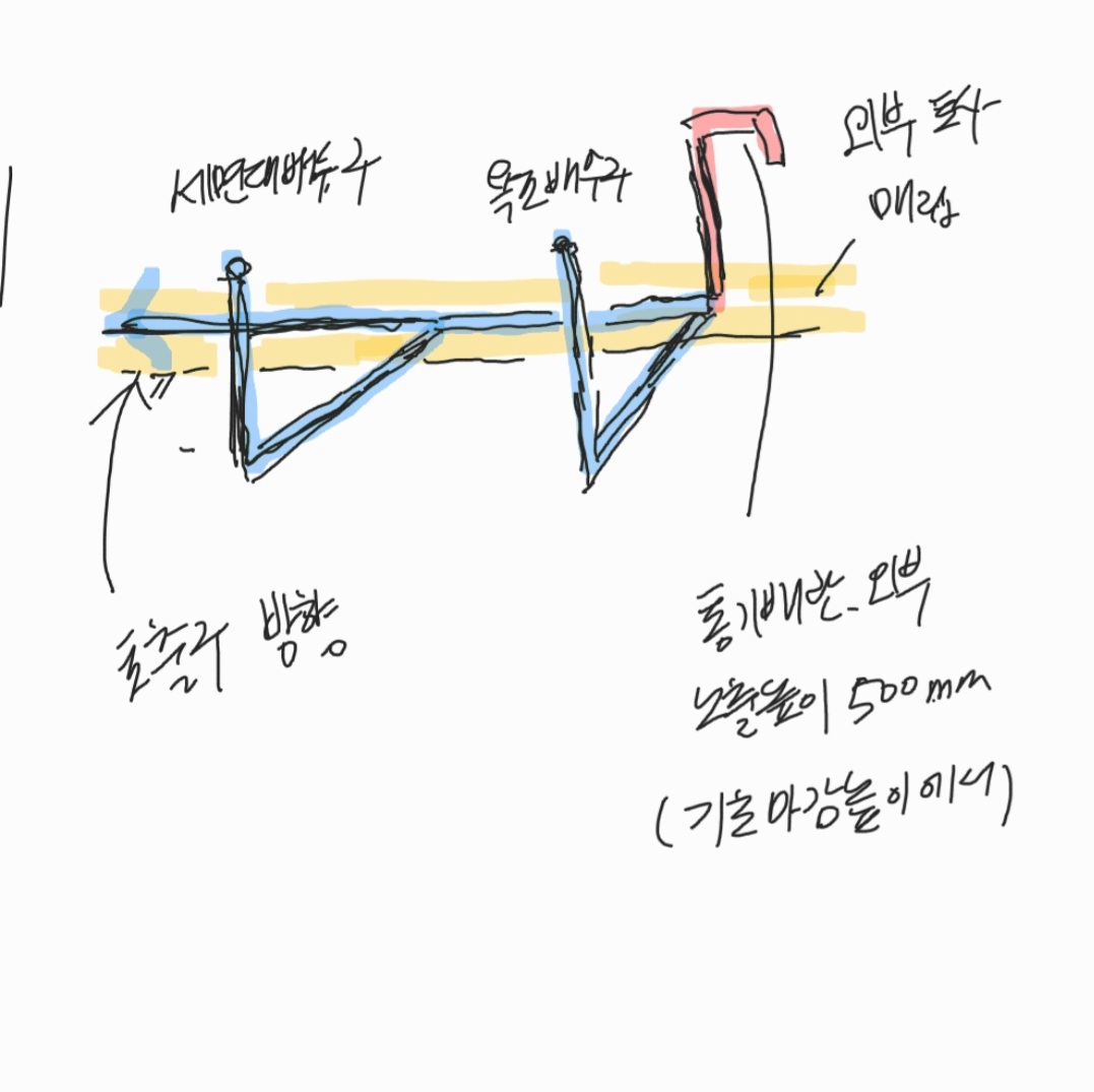 차라리 기초 외부로 합쳐서 나가는 배관에 통기구멍을 설치하는 게 더 나은 선택일까요? 이 때 통기 배관 높이는 기초높이보다 500mm 올라가게요.
