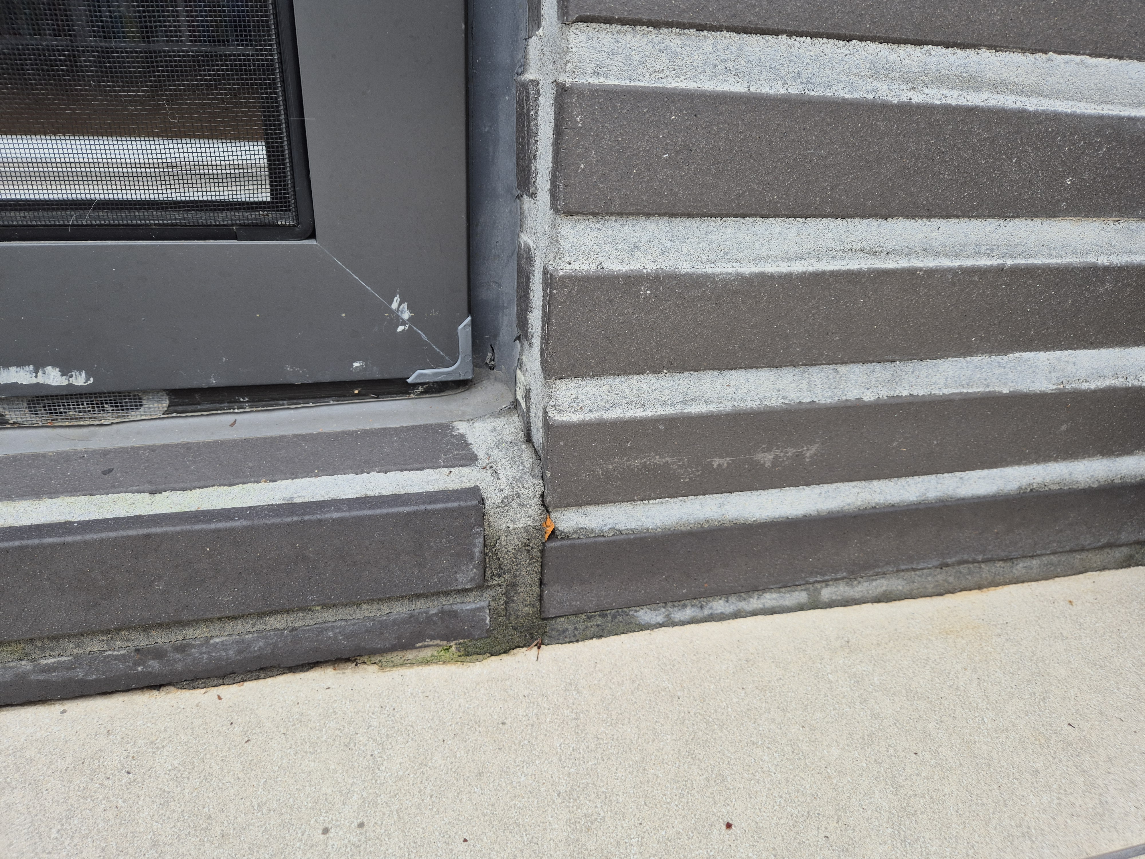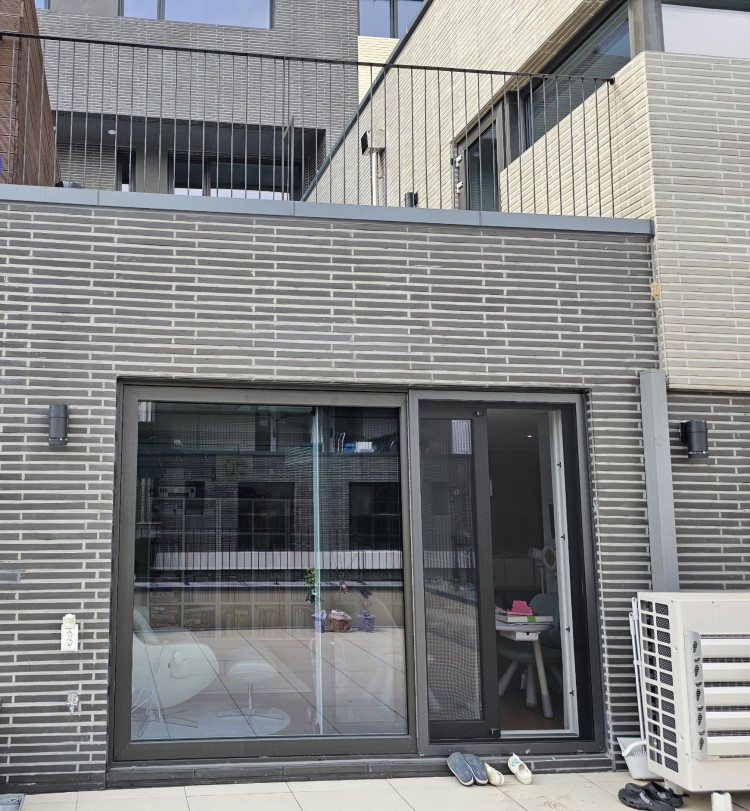 1. 창문 앞쪽에 금속 물끊기가 보이지 않기에, 창문 앞 벽돌타일 수평면