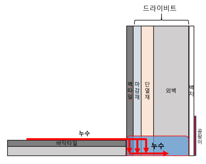 바닥과 벽체가 만나는 부위에 시멘트 액체방수를 시공 했을 것으로 추정하는데 하자의 양상으로 볼때 출입문 부위가 제대로 안됬을 확율이 높아 보입니다.