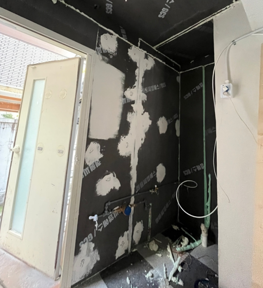 수도가 바닥에서 솟아 나와있고, 샌드위치 판넬 바로 앞에 위치, 샌드위치판넬+석고보드1p+페인트