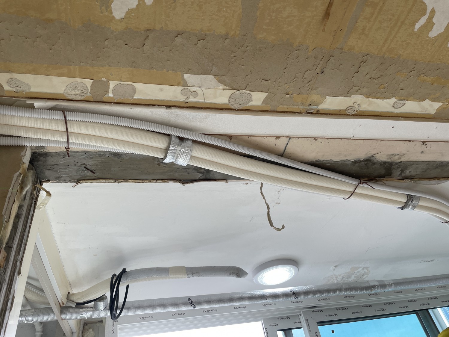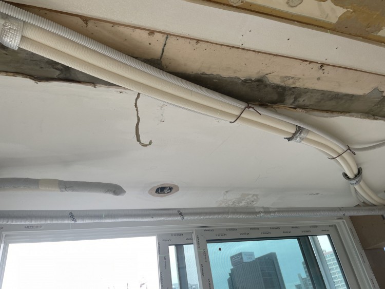 거실 확징부 천장에 단열 전에 시스템 선배관을 시공하게 되었습니다 ㅠㅠㅠ