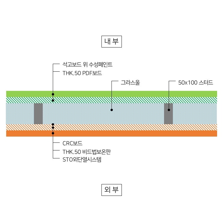 50x100짜리 스터드사이에 그라스울을 넣고 외부에는 CRC보드 - 비드법 T50 STO 외단열시스템, 내부에는 T50 PF보드 - 석고보드 - 수성페인트