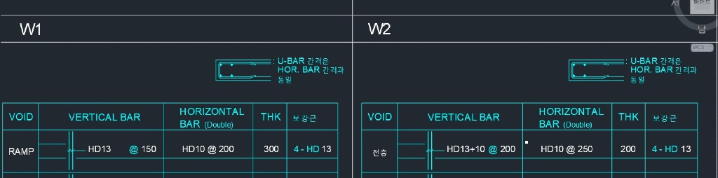 만약 기둥과 함께 타설된다면 수평보강근을 넣어야 하고요. 그렇지 않다면 수직보강근만 배치하면 되어요. 만약 수평근이 필요하다면 별도 표기가 되었을 겁니다.