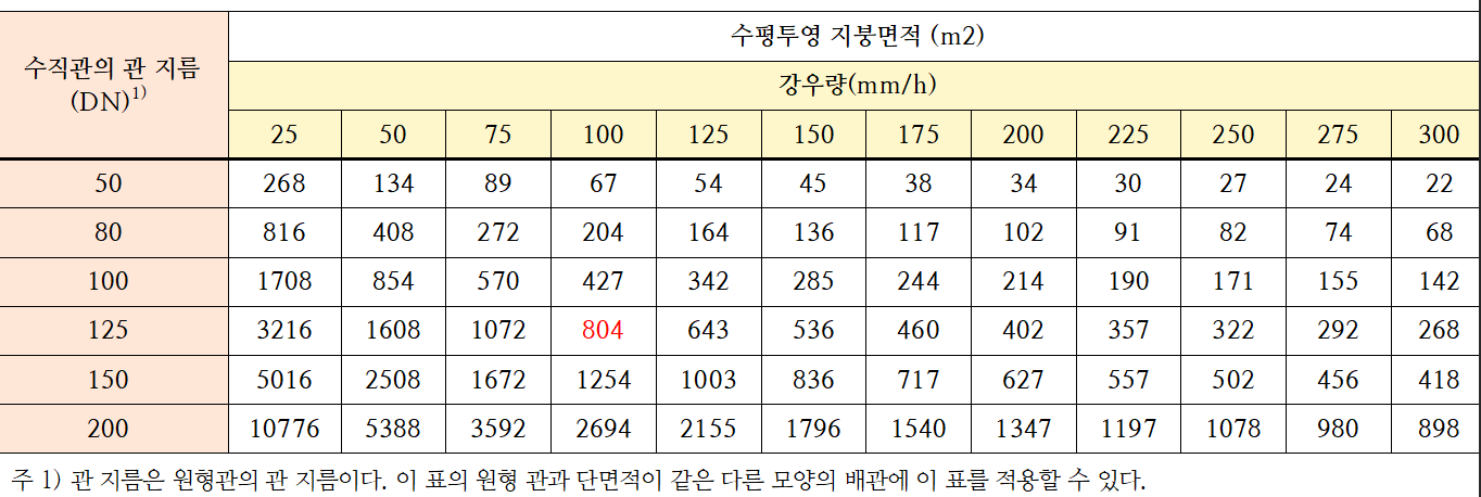 우수관의 지름은 지붕의 면적과 인접 벽면 면적의 1/2을 합산하여 지역에 따른 최대우수량을 고려하여 산정합니다.