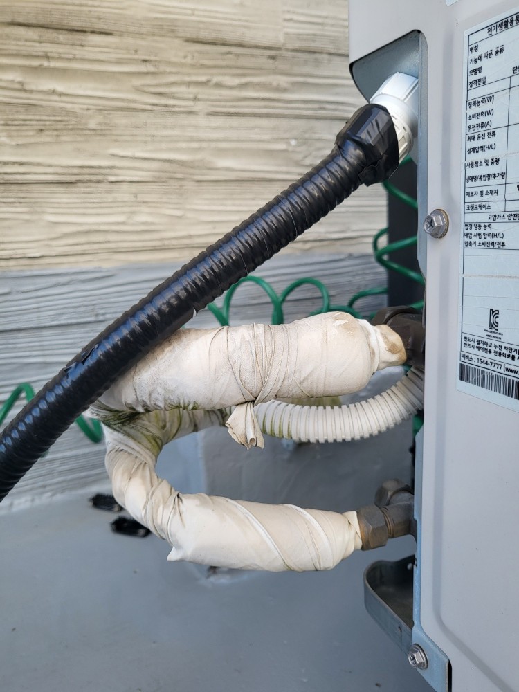 나중에 획인해보니 실외기가 옥상테라스에 설치되어 있는데  이 배관이 벽체 관통위치보다 높게 시공되어 있었습니다.