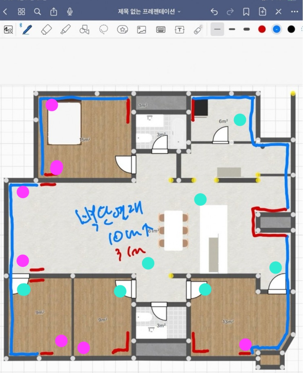 급기1개 배기1개(안방문앞)는 고정이고 추가로 급기1개나 급기1개 배기1개를 넣어도 괜찮다고 봅니다.