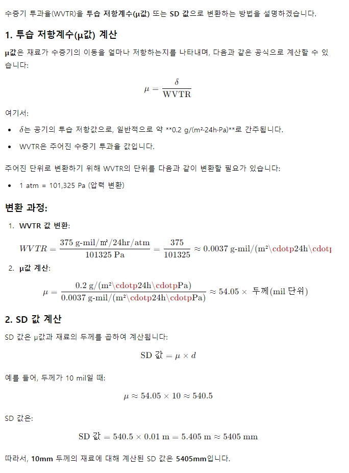 이 값을 직접 SD 값으로 변환하는 공식은 일반적으로 명시되어 있지 않기 때문에 실제 SD 값으로 변환하기 위해서는 WVTR 값을 따로 구해야 할 수 있습니다.