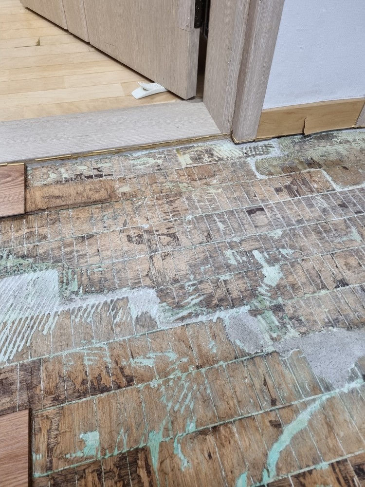 다가구주택으로 오고 나서 협회의 글과 영상을 많게 찾게 되었고 그렇게 배운 지식으로 집을 유지보수하는데 많이 활용했습니다. 그런 경험 때문이었는지 계획없이 보수를 해야겠다는 막연한 생각에 화장실 앞 데코타일 일부와 그 밑의 나무바닥을 겉어내었습니다.
