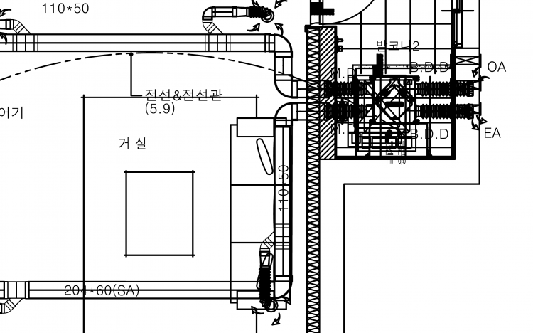 84m^2의 아파트이고, 이번에 설치하면서 OA와 EA의 위치를 바꿧습니다. (OA 윗쪽으로 보일러 연통 존재 및 창문에서 담배피는 사람들때문에....) 안쪽에서 배관을 꼬아서 갔는데, 문제가 분배기가 없는 배관이다 보니 강풍으로 하면 첫번째 SA디퓨저에서 바람 소리가 어마어마 합니다.