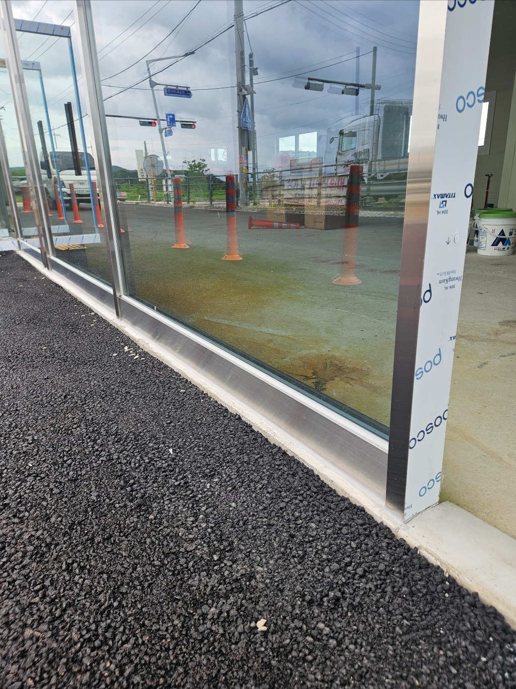 측면 물흔적 1.jpg전면: 스텐 시공 후 스텐과 기초 사이의 틈은 미장마감, 그리고 아스콘 시공 ( 실내 레벨보다 아스콘 레벨이 더 높음, 실내 미장한 후에는 실내 레벨이 더 높음. )