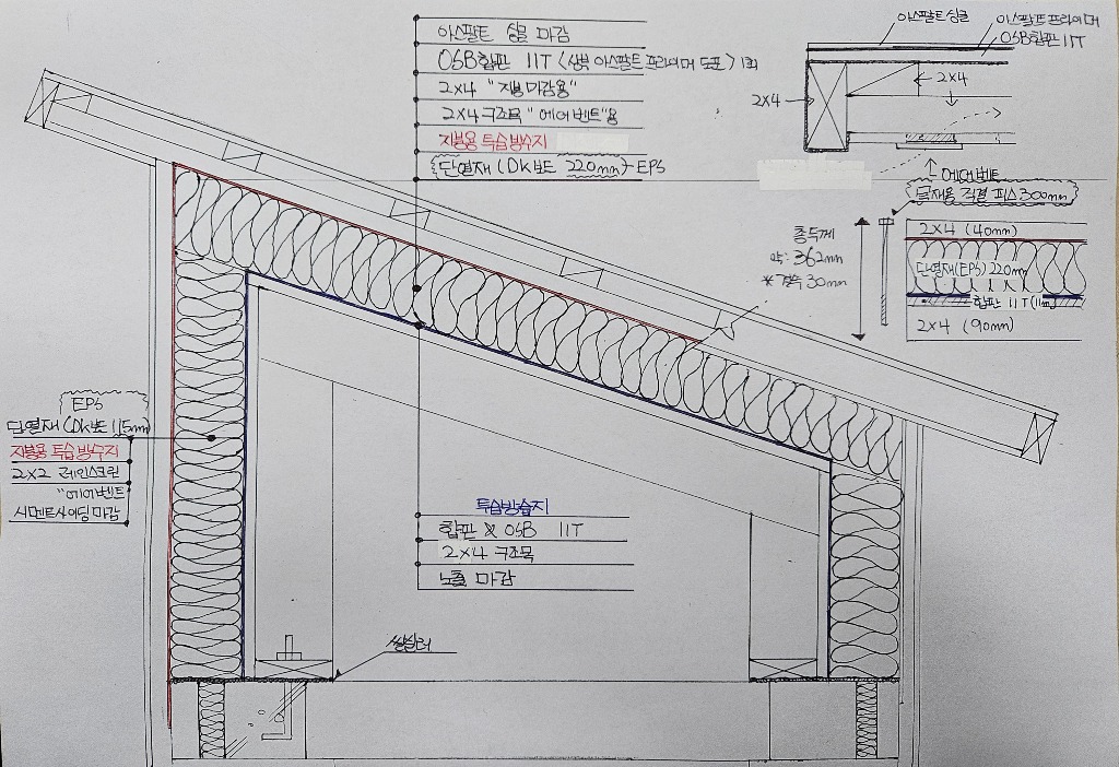 OSB 합판이 상부 EPS단열재에 의한 습기 방출이 이루어지지 않아 결로에 의해 썩지 않을까 하는 생각에 노출 마감으로 하여, 내부에서 공기 순환으로 이러한 현상을 방지하고자 중단열을 생각 하지 않고 노출 마감으로 하려 하였습니다.
