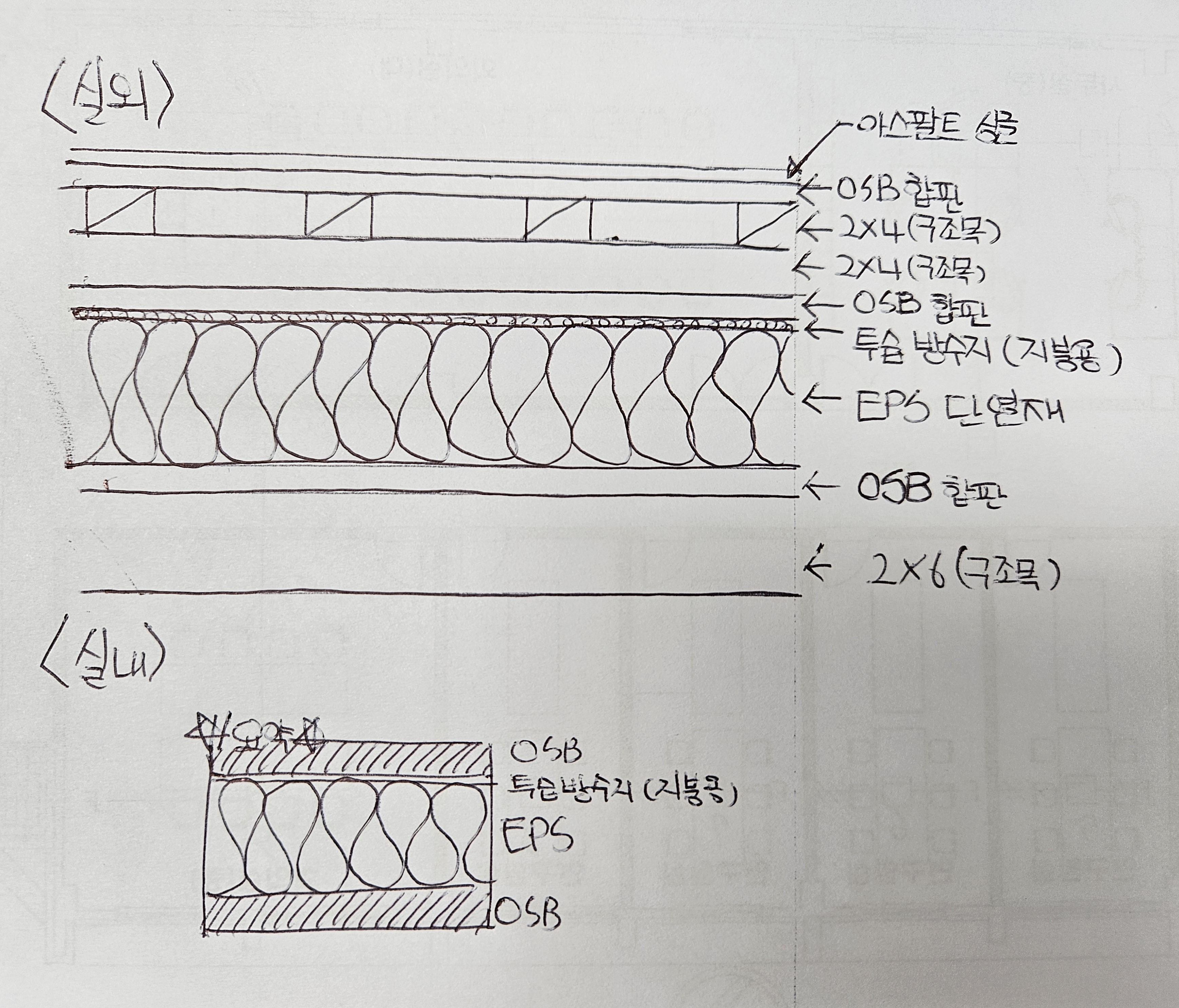 (외)EPS단열재 - OSB합판(이부분 합판이 썩지 않을까 하는 생각) - 구조목 - 글라스울 - 미송마감(내)