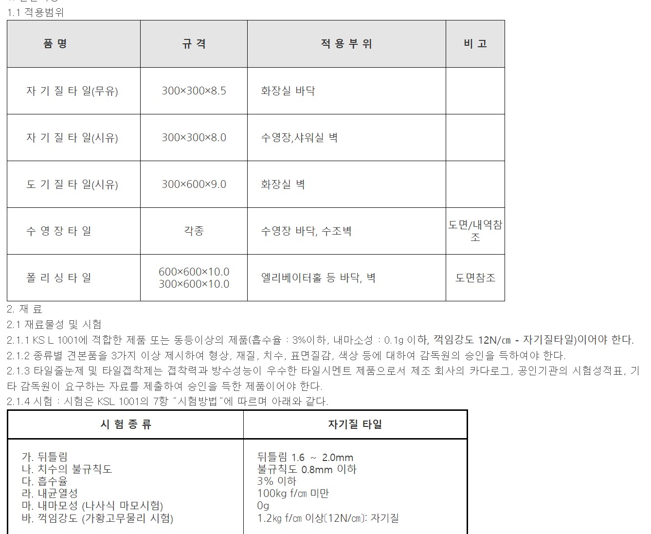 예를 들어, 압축강도, 흡수율(동결시험), 몰탈부착력 등이 있습니다.