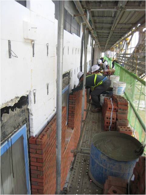 개구부 상단에 두께 3~5mm정도 철판을 깔고 그위에부타 상부 치장벽을 쌓기 시작하였습니다. 그 하부는 세 치 정도의 각목을 받쳐서 쌓기용 모릍타르가 충분히 굳을 때까지 상재 하중에 의한 쳐짐을 방지하는데, 국내 현장 대부분은 받침용 철판대기가 생략되고 개구부 가로 사이즈에 맞춰 각목을 설치한 후 바로 벽돌쌓기를 하는 것이 일반적입니다.