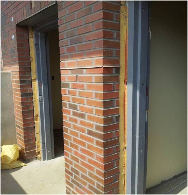 상단은 강재 인방이 설치된 위에 마감재인 치장벽돌을 쌓고, 옆 면은 치장벽돌을 감아 돌리기 위해 단열재를 잘라 냈습니다.
