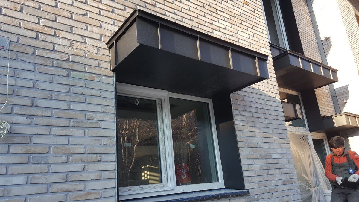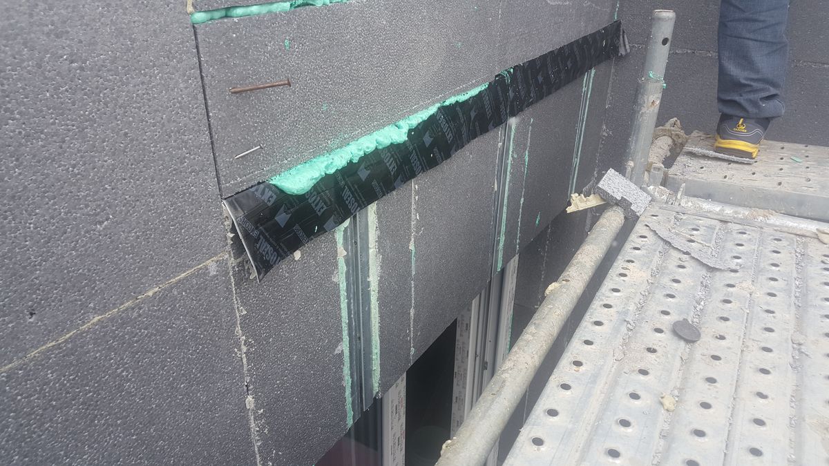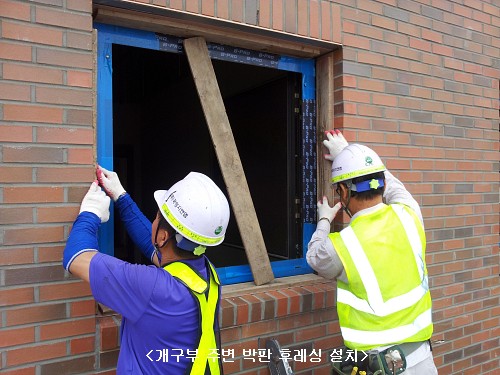 아래 사진은 열교를 방지하기 위해 창틀 단부까지 단열재를 밀어 내어 설치한 것을 감추기 위하여 박판의 flashing을 설치하고 있는 장면입니다.