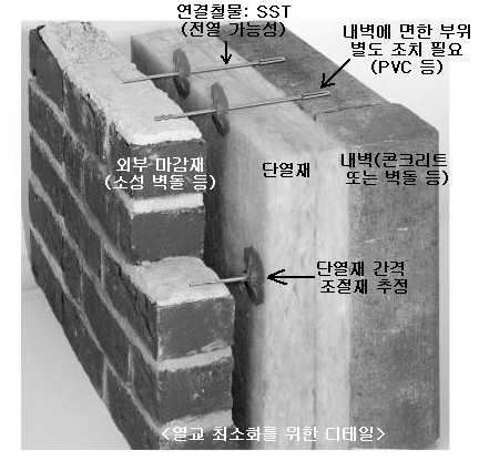 창호와의 연결부위가 제일 취약부위이기는 하지만 이 역시도 여러 방법의 디테일로 충분히 해결이 가능합니다. 마찬가지로 지중에 보통 설치되는 적벽돌을 위한 기초도 충분히 끊어서 열교없이 시공이 가능합니다.