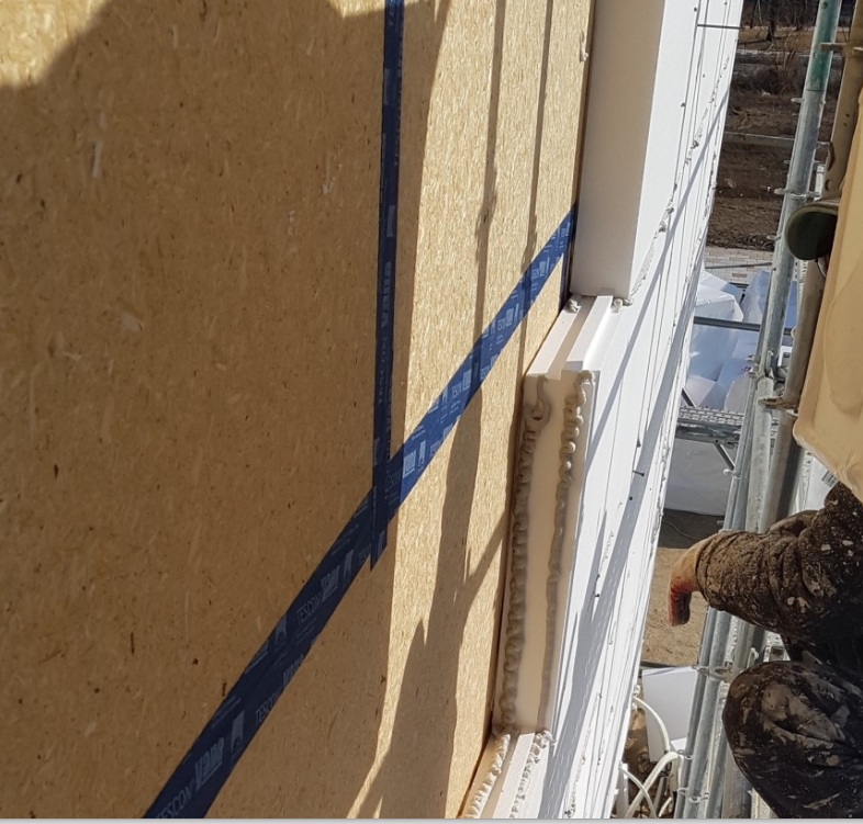 이 부분은 이미 외부의 EPS + 외단열미장마감으로 거의 대부분의 기능을 수행할 수 있습니다. 단지 창호 등의 개구부와 OSB 사이에 방수테잎을 시공하는 것이 다 입니다.