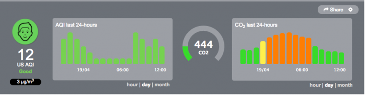 어제 이산화탄소 미세먼지 측정가능한 제품 airviaual node를 안방에 놓고 공기 측정을 해 보았습니다.