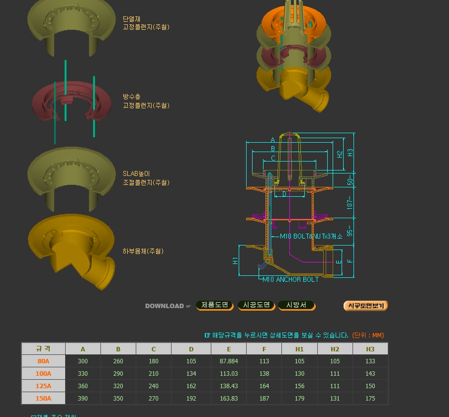 처음에는 sus나 프라스틱재질로 재작하였으나 내구성이나 철근작업시 자주 파손이 되어 부득 주철로 변경하였읍니다