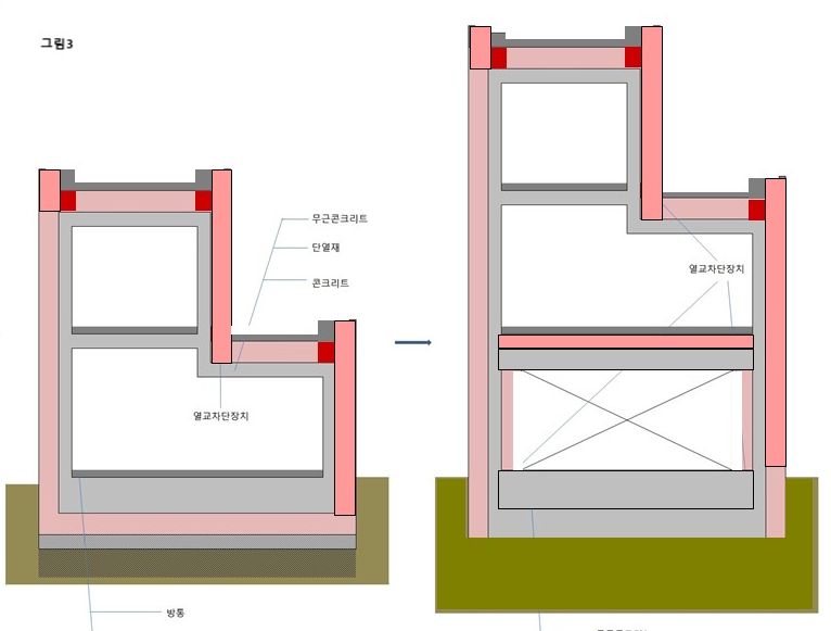 1층을 2면은 막히고 2면은 뚫린 피로로티로 만들어서 한 층씩 위로 올리고 싶은 경우 단열이 끊어지는 2번 그림 보다 3번 그림이 올바른 설계 인가요?