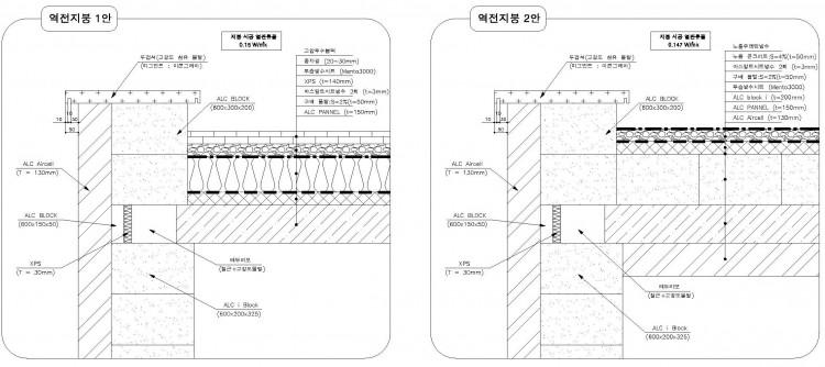 2안은 역전지붕 + 온지붕을 장점을 혼합하여 ALC블럭을 활용한 양단열 지붕을 만들어 봤습니다.