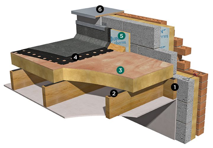 이 때, 가장 주의할 사항은, 콘크리트조도 마찬가지지만, 목구조는 벽(파라펫)과 바닥이 만나는 모서리가 직각으로 형성되지 않도록 하는 것이 가장 중요한 덕목입니다. 모서리를 둔각으로 만들고, 그 위에 방수를 해야 하며, 이 둔각을 이루는 삼각형의 길이는 최소 50mm가 되어야 합니다. (첨부 그림 참조 - 출처: https://www.quinn-buildingproducts.com/resources/insulation-solutions/flat-roof-timber-deck-insulated-above-joists/ )