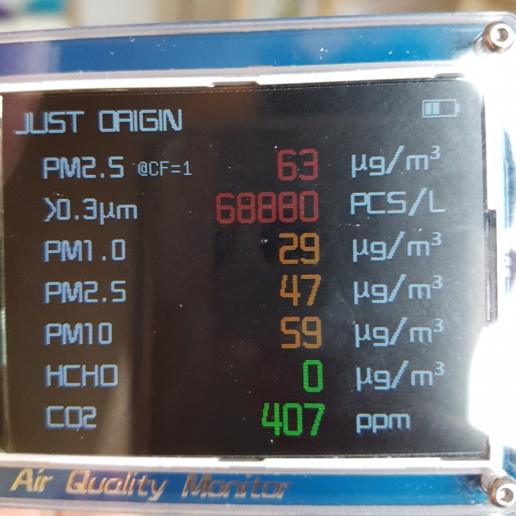 초미세먼지(PM2.5)->47mg/m3 , 포름알데히드(HCHO)->0mg/m3, 이산화탄소(CO2 )->407ppm
