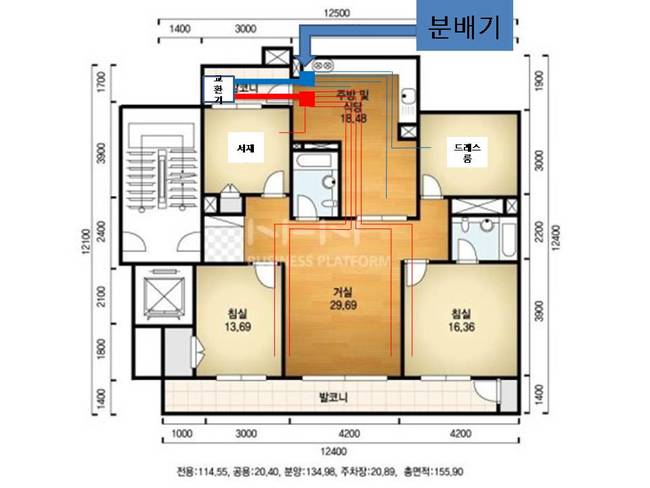 만약 그런 식이라면.. 분배기의 위치는 실내측(난방공간)에 있어야 합니다. 열이 교환된 후의 공기라서 외기에 면하면 그만큼 열손실이 커지기 때문입니다.