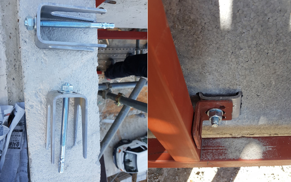 단열재 화스너- 돼지발톱또는 까치발 화스너라고 하는녀석으로 슬라브와 각관을 연결한 모습을