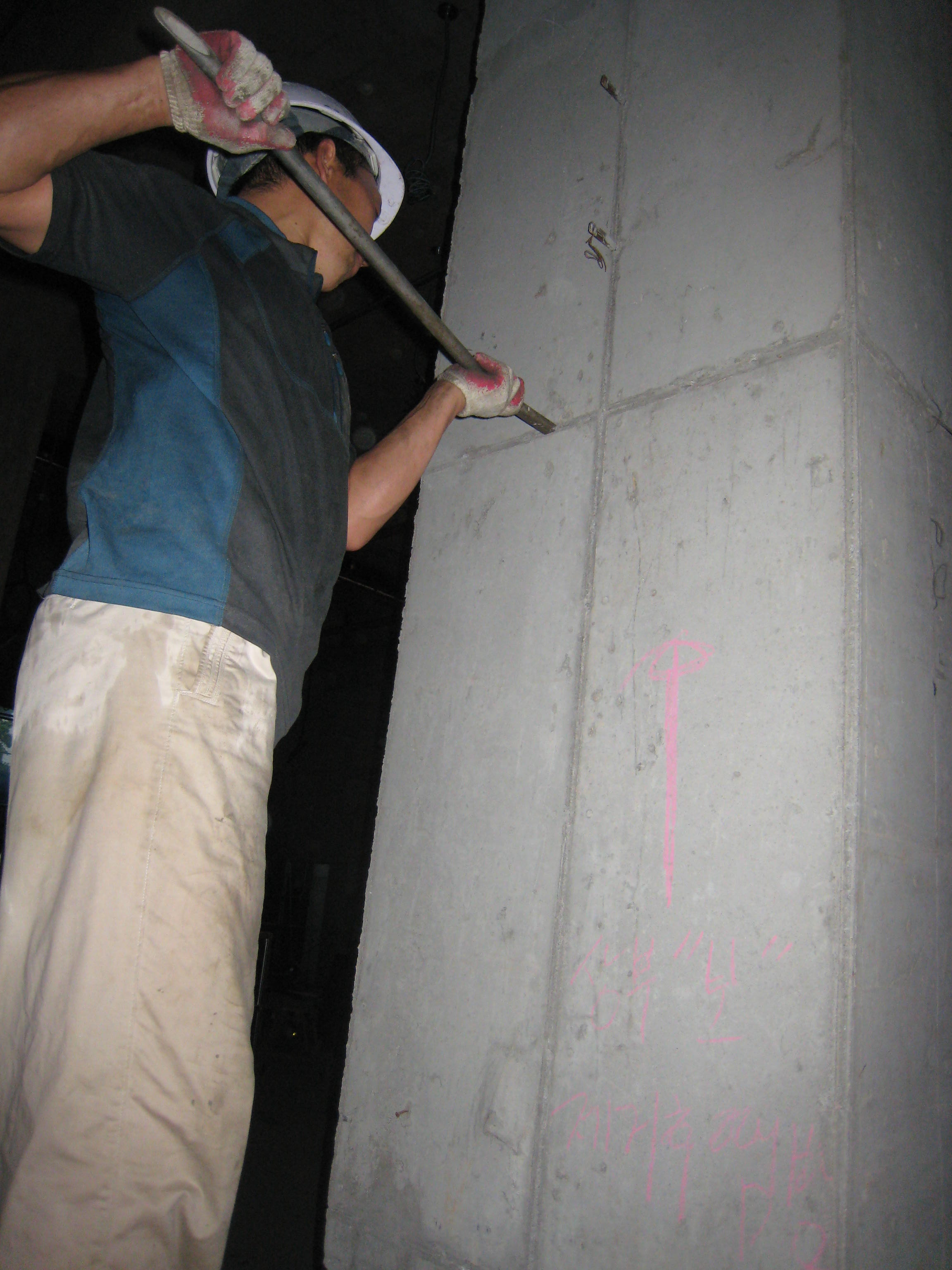 거푸집 탈형후 세파볼트 제거하고 우레탄-폼을 주입하여 단열재의 구멍자리를 메꿈합니다.
