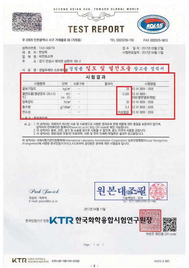 이때 혼동하실 수 있는 부분이 원재료의 밀도와 시험성적서 상 나오는 단열재의 밀도가 다르다는 겁니다.