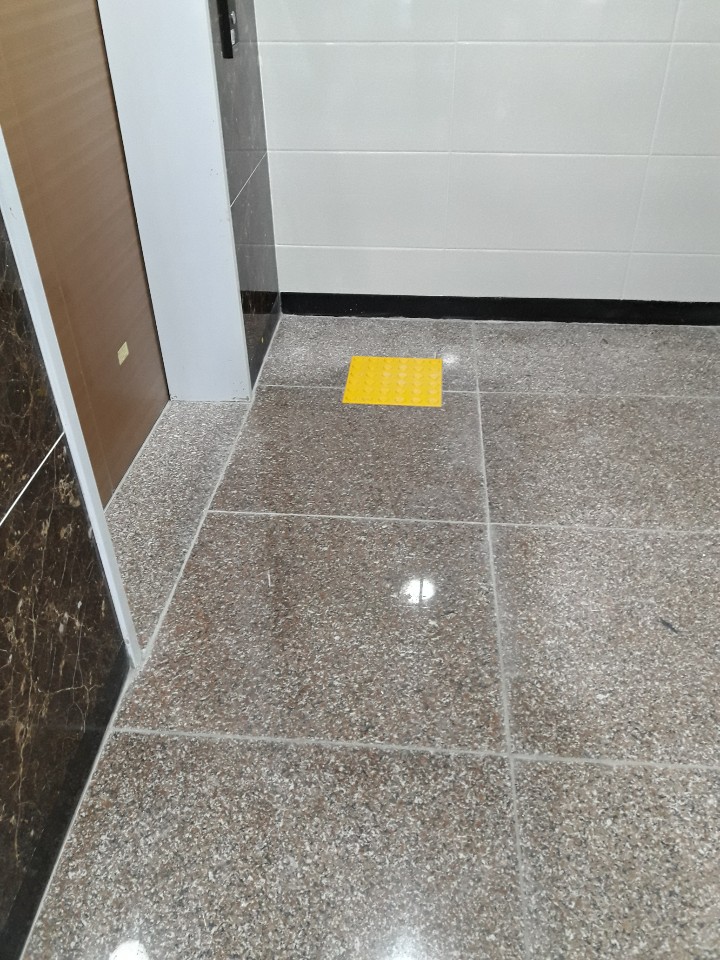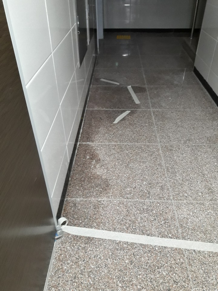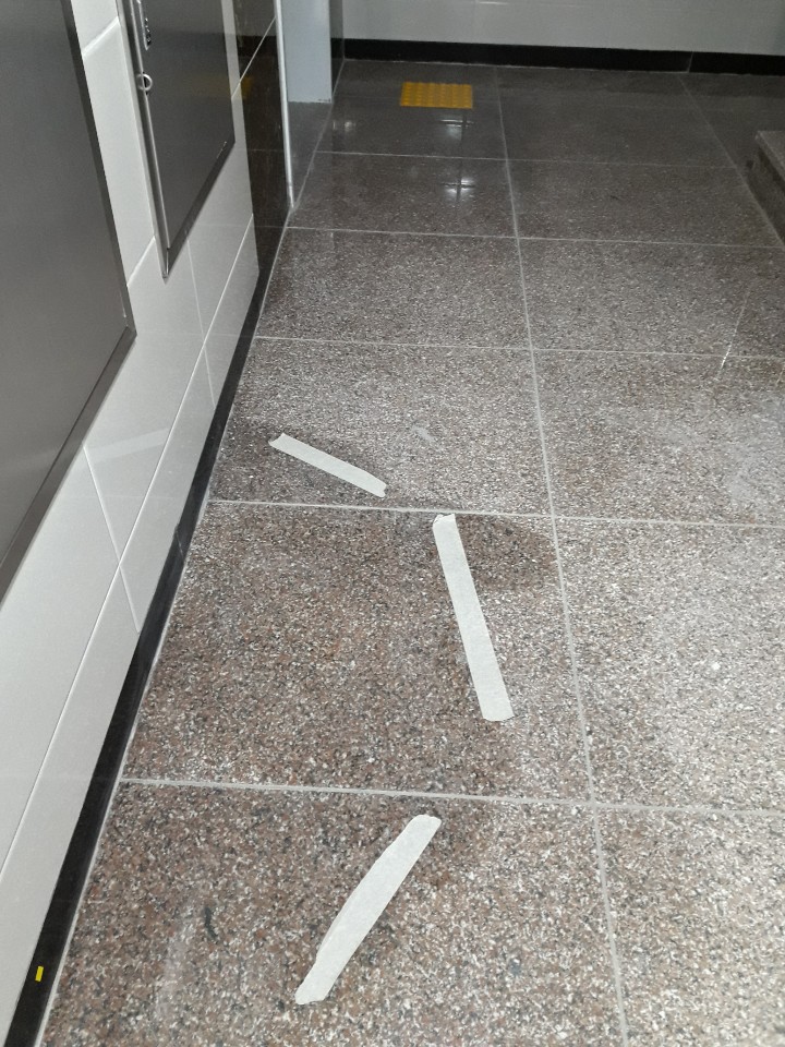 바닥돌 얼룩이 지는 방향은 중앙 현관을 지나 왼쪽방향으로 길게 엘리베이트 입구까지 얼룩이 번져 가고 있습니다.