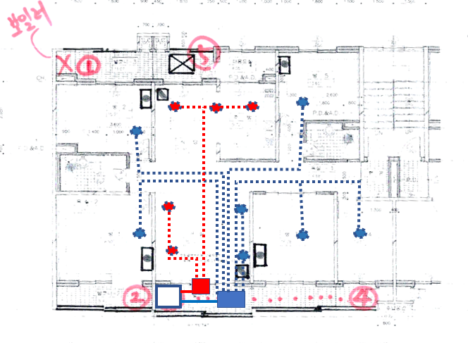 유력한 위치는 3번에 두는 것인데요. 배관거리를 문제가 되지 않을 거리입니다. 어차피 거실앞에 분배기를 두고 그 분배기 까지는 하나의 배관으로 와야 하니까요.