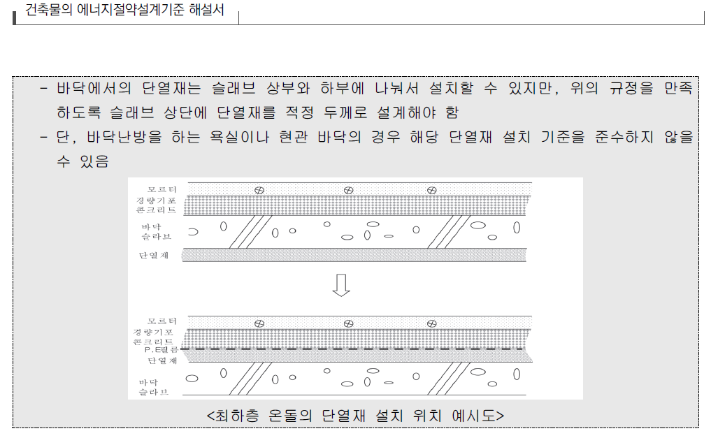설령 대상이라고 하여도 바닥 슬라브 하부에 단열재가 시공되었다면 바닥위로의 단열재 삽입은 생략해도 되며 반반씩 나누어도 총량만 맞으면 된다고 합니다.