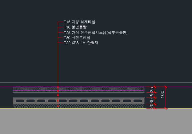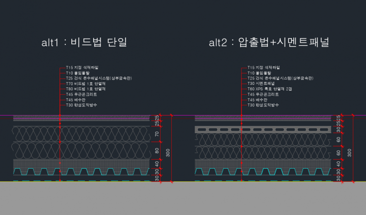 T30 탄성도막방수(단열 외부에 방수처리 하기에 탄성도막방수로 계획 하였으나, 침투성 방수 등으로 방수공정 및 두께 간소화 가능한지 검토 요청드립니다) 위에 T30 배수판 설치하였고(지하층은 아니므로 T45 사용하지 않음), 단열부 부터 두가지 방법으로 계획 해 보았습니다.
