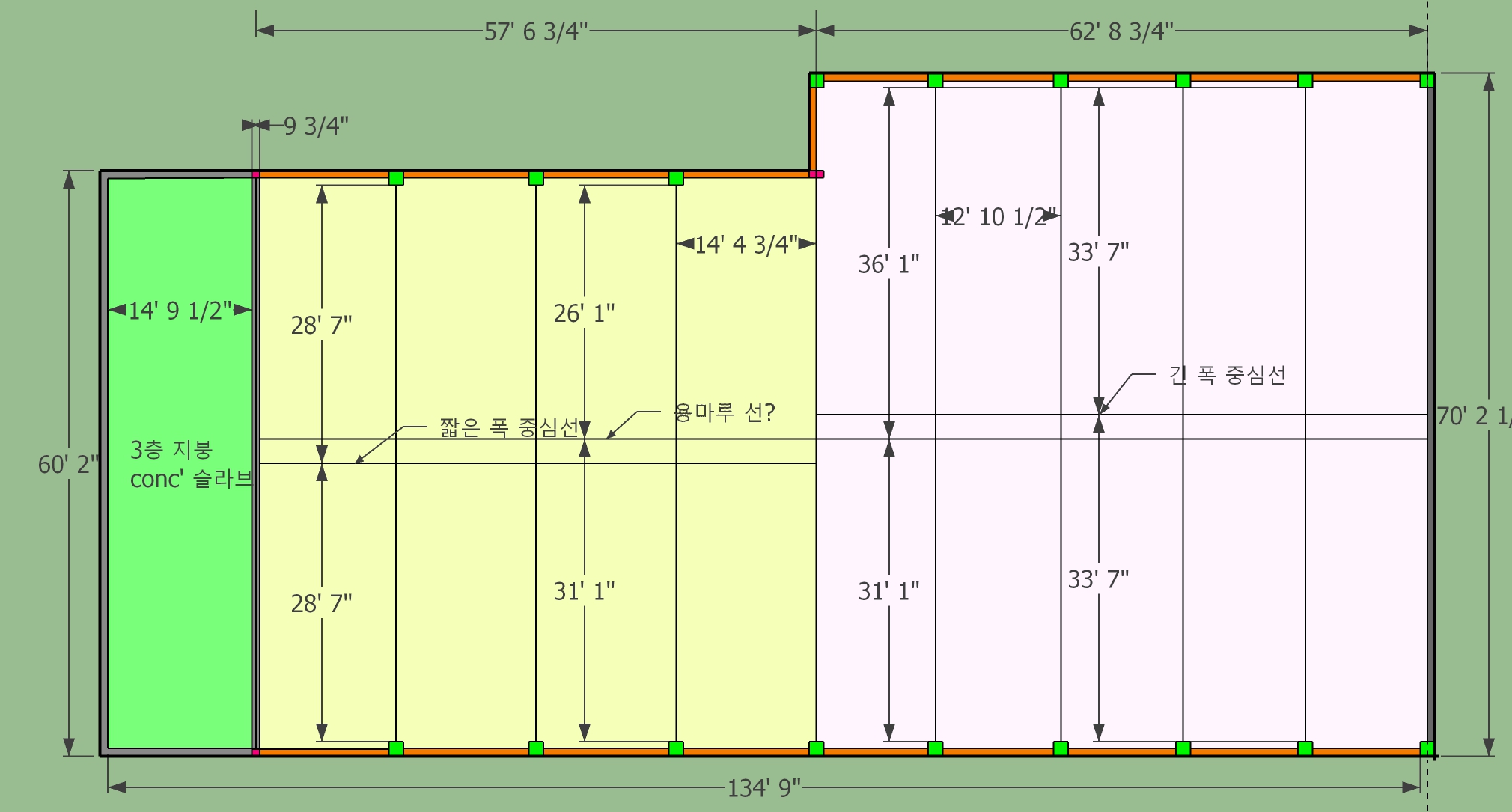 녹색 구간은 3층 건물 슬라브 지붕이고,
