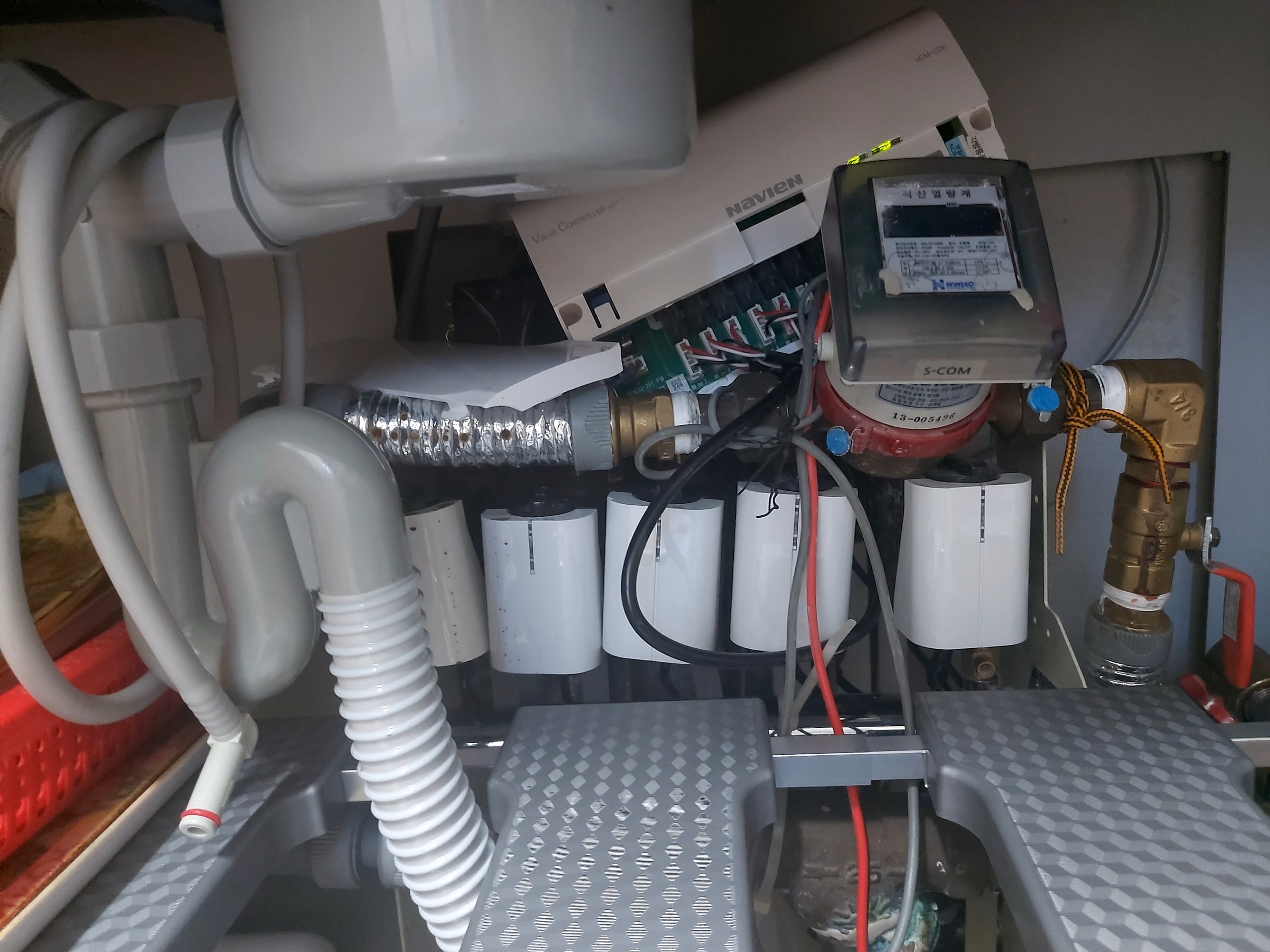 심크대 밑으로 이전 실치된ㅈ난방ㅈ분배기  사진입니다.