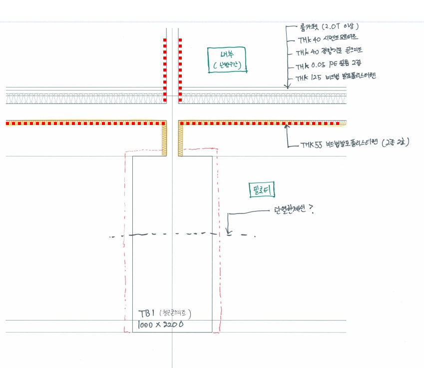 본 설계가 TB 목내림 구간 까지 단열재(발포폴리스티렌 2종2호) 시공으로 되어있는데, 열관류율에 영향이 있는지, 영향이 있다면 단열한계를 어디 까지 둬야하는지에 대하여 의문이 들어 질의 드립니다.