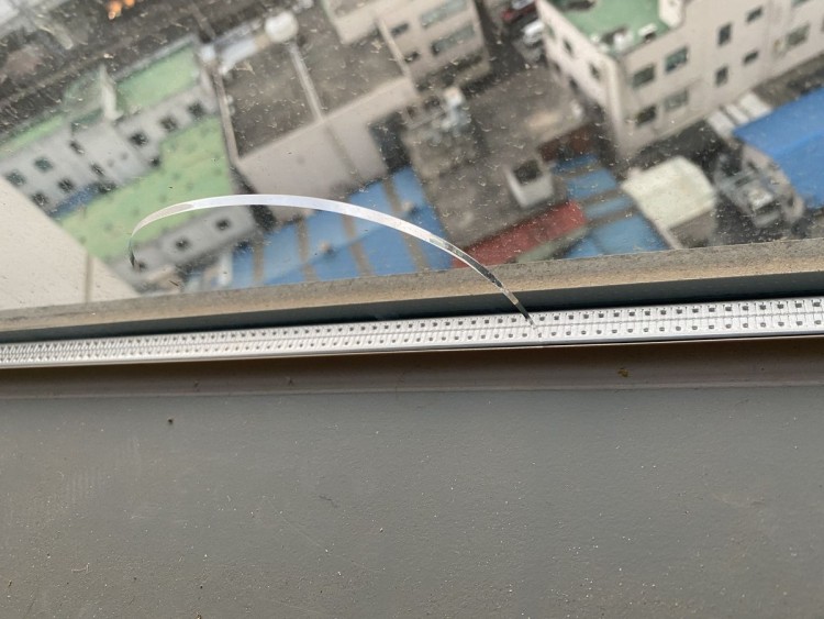 얼마전 새로운 보금자료로 이사하고 전 사무실 자리로 이사 오는 분이  유리가 파손 되었다고 해서 방문해 보니 유리 하단의 중앙에서 C자로 금이 갔더군요.